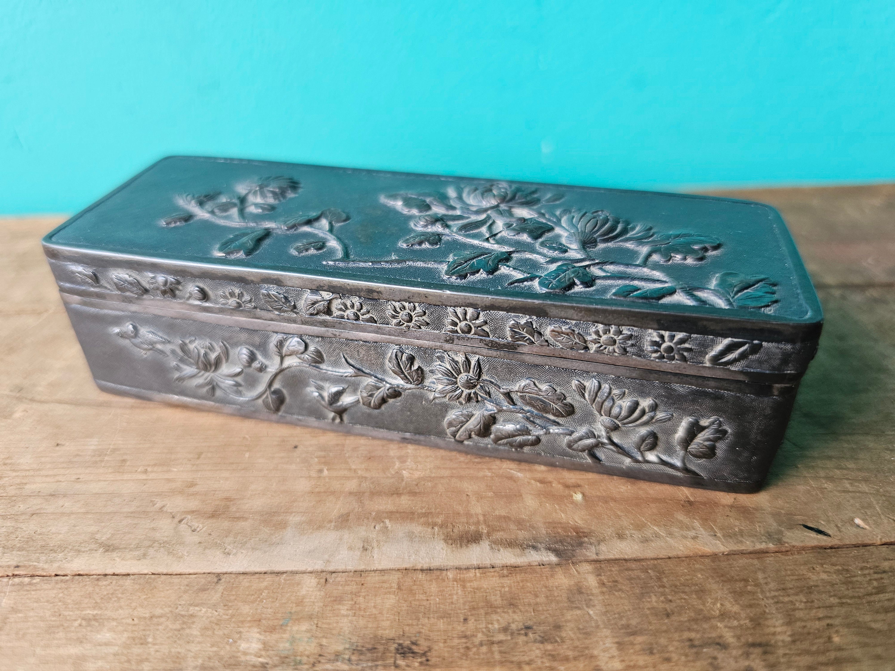 Beautiful and very rare find. This hand carved antimony trinket box has beautiful detail in the raised relief featuring chrysanthemum flowers, foliage and a couple of precious little birds. The interior of the box is silver plated. The box is stamped underneath LH 90 for Luen Hing dating it to the turn of the century. In good condition showing some tarnish on the outside but still bright in the interior. No dents or flaws in the relief design. Please see pictures carefully and let us know if you have any questions!